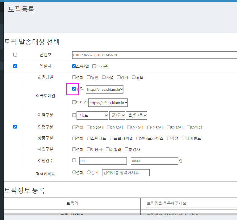 3. 해당 도메인소속 회원에게 푸시 발송을 할 때는 셀링도메인  체크를 꼭 해줘야 한다.